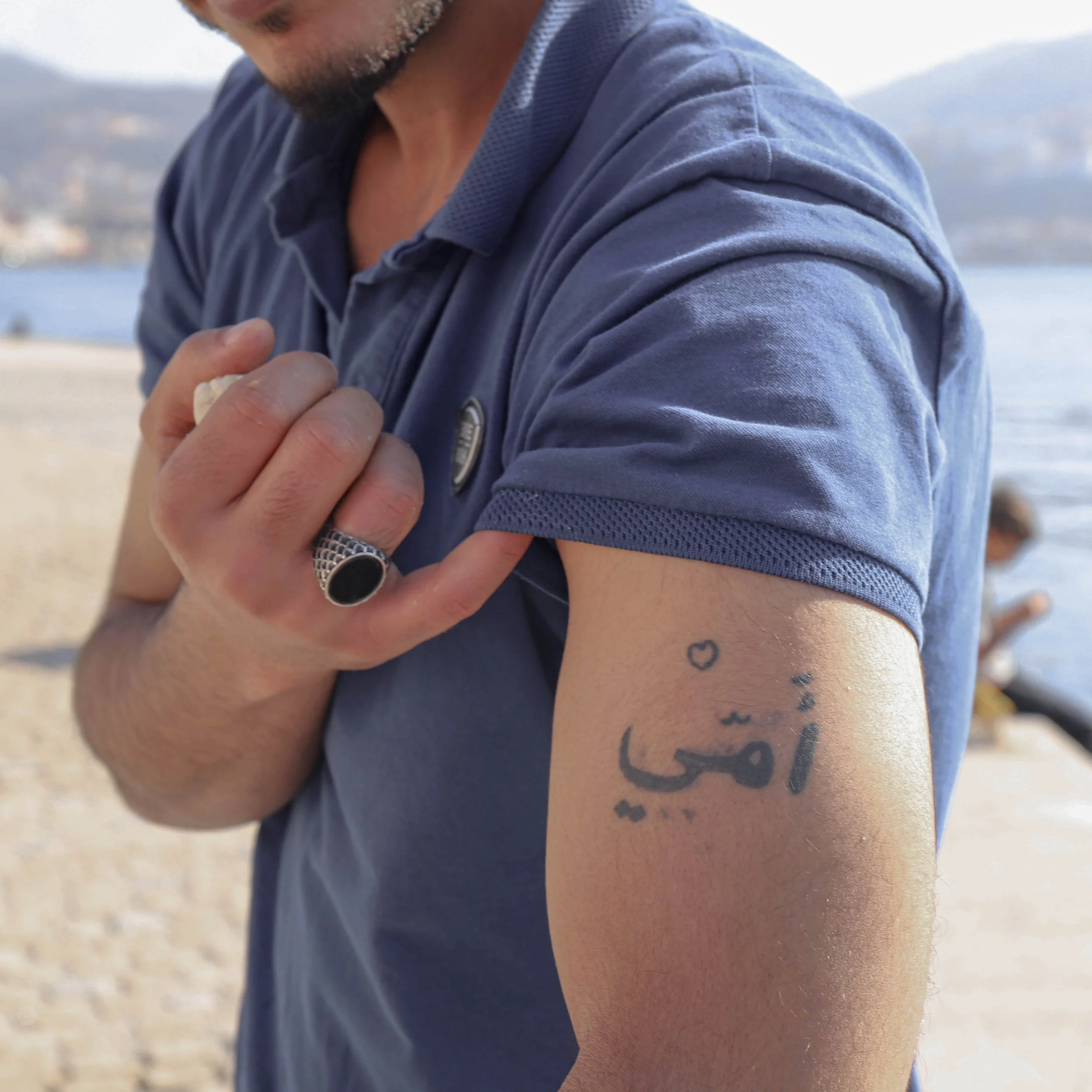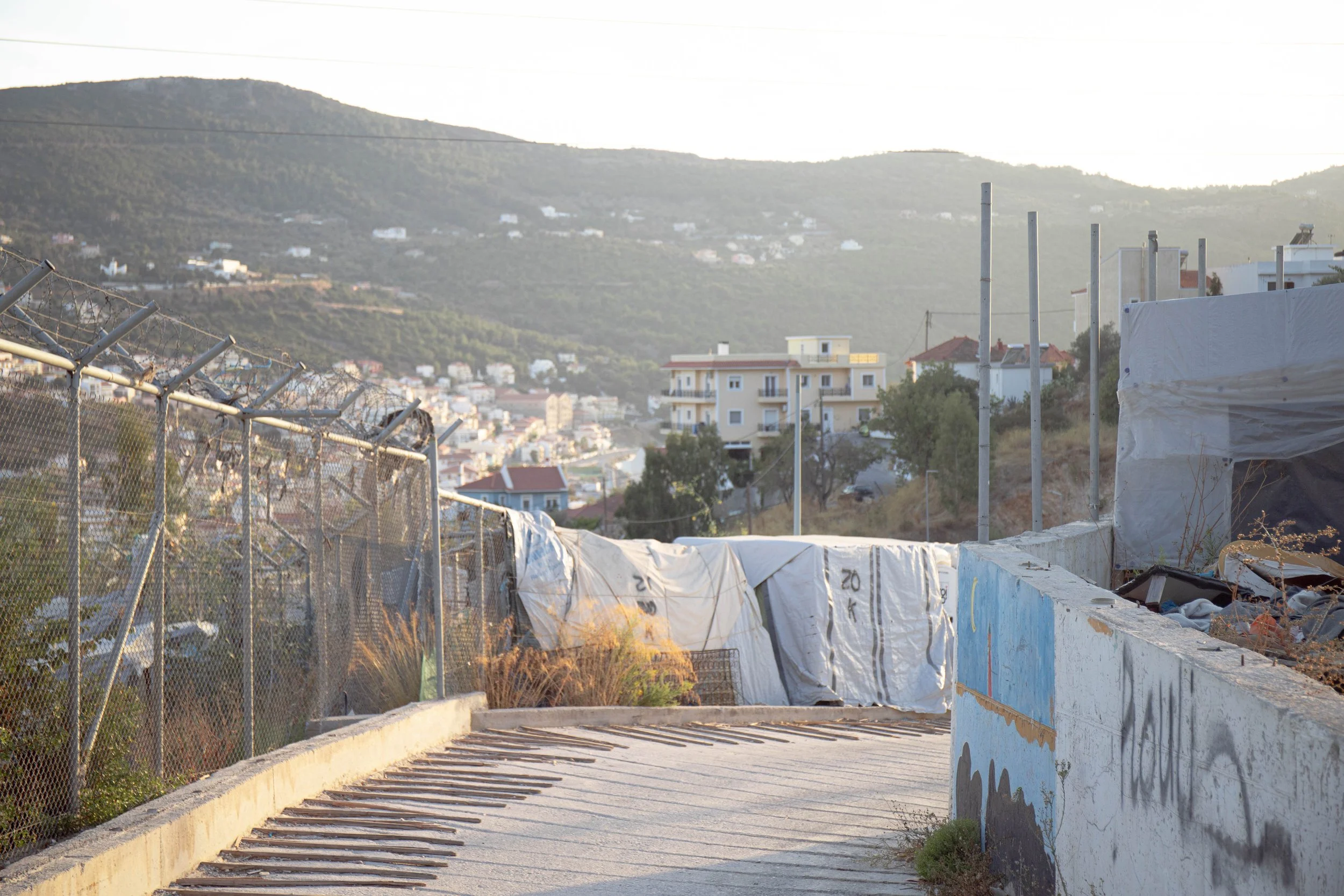 A place where dystopia meets postcard beauty. On Gagou Beach, the nearest stretch of sand to the island’s main town, Vathy, tourists from around the world lounge on rented sunbeds, just steps away from an abandoned building now used by asylum seekers living in the island’s Closed Controlled Access Center. For many of them, it’s the only beaches accessible, the bus passing by.
